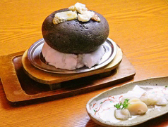 松花堂コースに海鮮の石焼き(熱い石の上で魚介類を焼く料理)が付きます。※海鮮の石焼…旬の海の幸を熱した石の上で焼いて、お召し上がりいただきます。コーヒー・自家製デザート付き